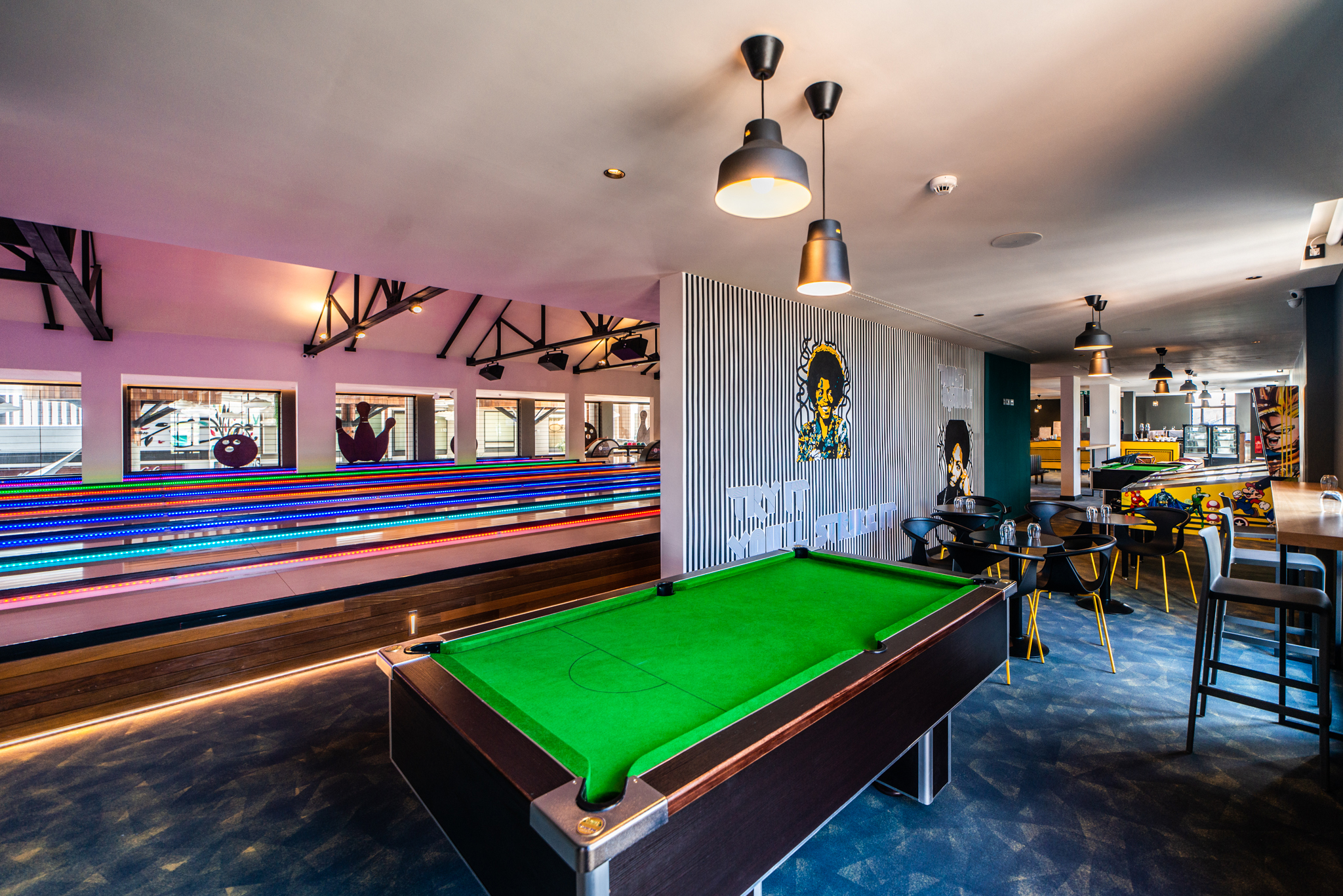 Un projet d’une grande ambition, à l’origine toutes les colonnes du bâtiment étaient néfaste à la mise en place de 10 pistes de bowling. Un travail d’ingénierie a permis de le créer. Toute la structure métallique était cachée sous des faux-plafonds et lors de la démolition ce fut une belle surprise ! La mettre en valeur par un noir intense était obligatoire. Nous avons développé un style vintage industriel mêlé à un sol développé par Forbo, en partenariat avec Philippe Stark.